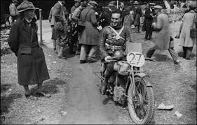 El campeonato del mundo de velocidad se celebró por primera vez en 1949 , después de terminar la segunda guerra mundial , constando de cinco categorías , 125cc , 250cc , 350cc , 500cc y sidecares. Antes de empezar la guerra se corría el campeonato de Europa. Pero tenemos que retroceder a principios de siglo para conocer el inicio de las competiciones. En Gran Bretaña se empezaban a organizar carreras en cuestas y de trial , pero la limitación de velocidad a 32 Km/h obligó a los pilotos británico a marcharse a correr a Europa , tomando de aquí el nombre de Continental Circus. Se empezaron a organizar trofeos por toda Europa , como la París - Berlín o la copa del mundo , que se disputó por primera vez en Francia. Al principio las carreras transcurrían por caminos de tierra y en ocasiones una vuelta podía abarcar mas de 20 kilómetros. En Gran Bretaña , en el año 1907 y más concretamente en la Isla de Man de disputó por primera vez una carrera oficial sin límite de velocidad. Esta sería la primera carrera del denominado Tourist Trophy (TT). Se realizaba por las calles de la isla y se convertiría con posterioridad en una de las pruebas más importantes del mundial. El primer circuito permanente del mundo sería el de Broodklands (Gran Bretaña) , inaugurado en 1907. Si tuvieramos que destacar un primer nombre en las carreras de motos , ese sería sin duda el de Stanley Voods. Comenzo a correr a principios de los años viente y se ganó el respeto y admiración de sus rivales por su forma de pilotar y sus victorias en el TT. A la izquierda , bajo estas líneas , una de las primeras imagines en la Isla de Man , a la derecha , Stanley Voods.